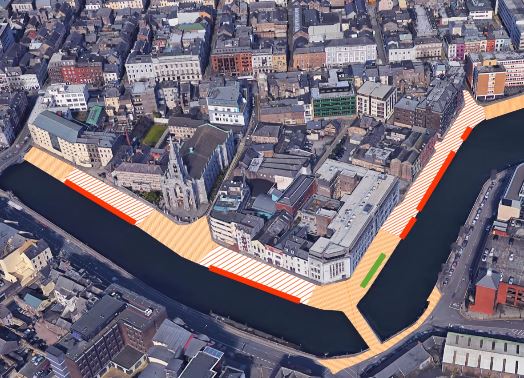 The scheme includes an enhanced south-facing quayside streetscape, with improved pedestrian and cycling facilities, between Parnell Bridge and Parliament Bridge, a viewing platform over the river Lee, three new public plazas, and a mini-boardwalk as well as integrated flood defenses.
