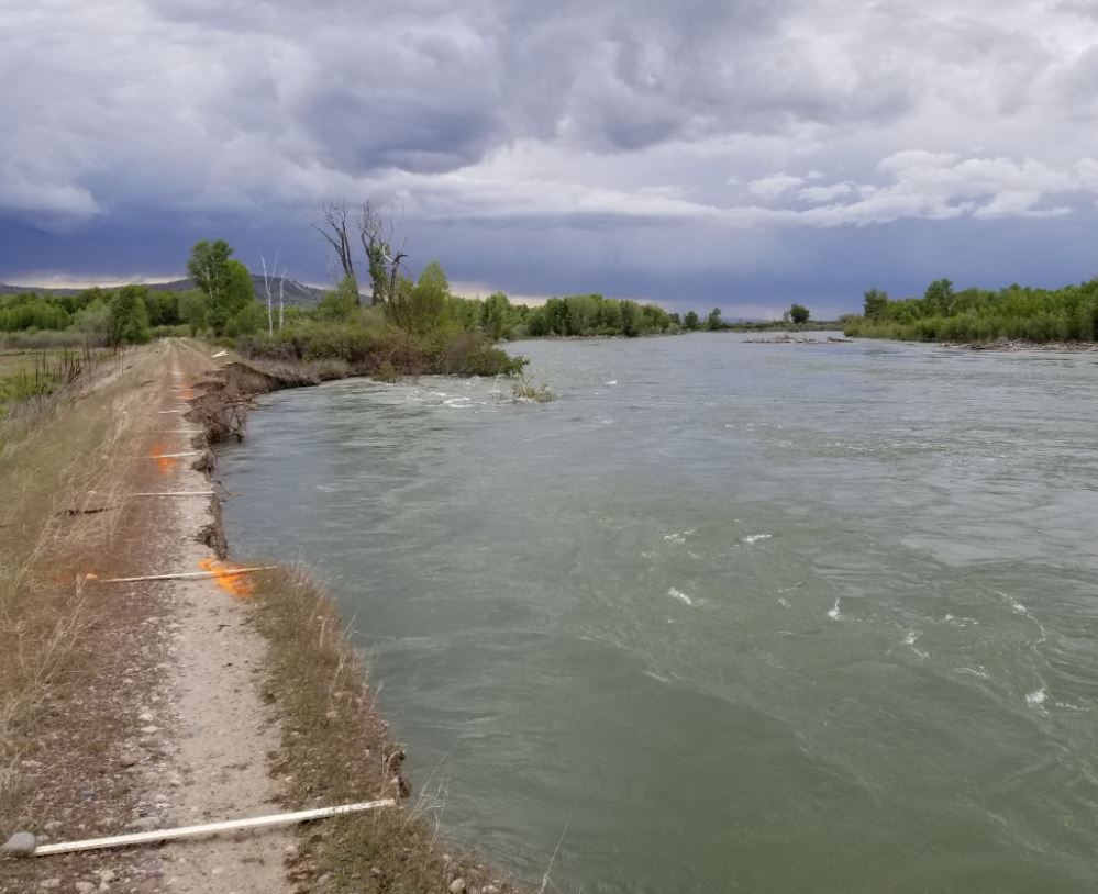 High-flow conditions in the Snake River are eroding a segment of the Heise-Roberts Levee System, about 3.7 miles downstream from the U.S. Route 20 bridge.