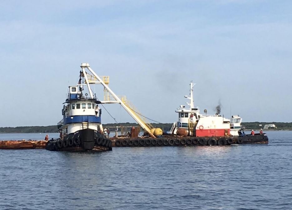 The first of three tug-boat shipments of submergible pipe arrived on August 25, 2018. Two more shipments of equipment are scheduled to arrive within the next couple of weeks, which all together will comprise the needed five-mile pipeline, said USACE.