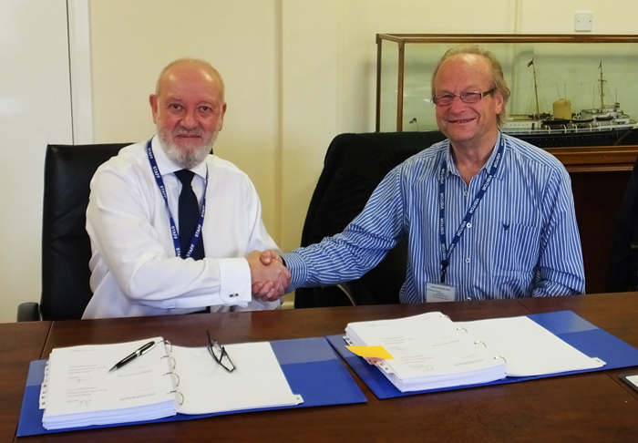Portland Port's CEO Bill Reeves and CMP Thames Ltd. Director Julian Branford signing the contracts. (Photo courtesy of Portland Port)