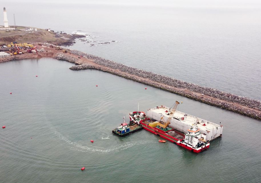 The caisson – 50 meters long, 17 meters wide and 16 meters high – has been floated from Cromarty Firth to Nigg Bay, Aberdeen, in a 160-mile journey.