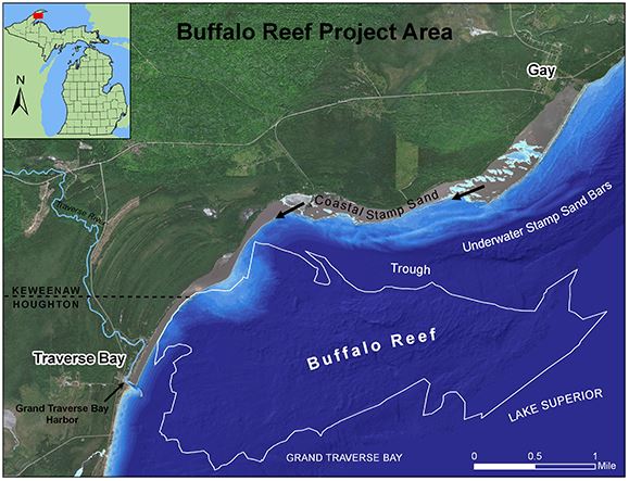 Mine tailings, called stamp sands, were dumped a century ago into Lake Superior at Gay, Michigan, during processing of copper ores from the Mohawk and Wolverine mines. Since that time, the sands have moved south along the shoreline with wave action toward the reef.