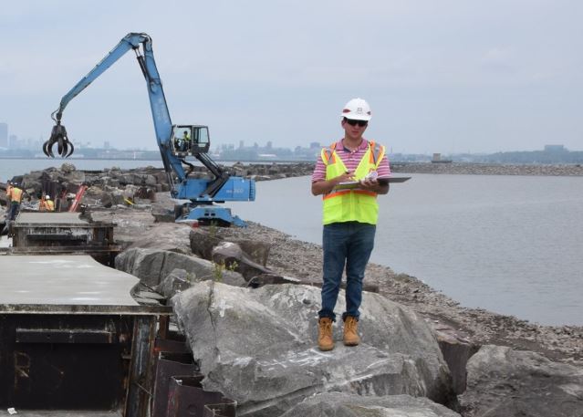 The project design includes a 1,325 linear foot armor stone revetment made up of 3-foot diameter boulders to absorb the wave action as it comes in from Lake Erie.