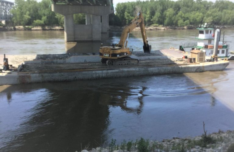 During last year’s flood, the riverward rock slope was damaged due to the scour activity of the Missouri River’s high-water levels.