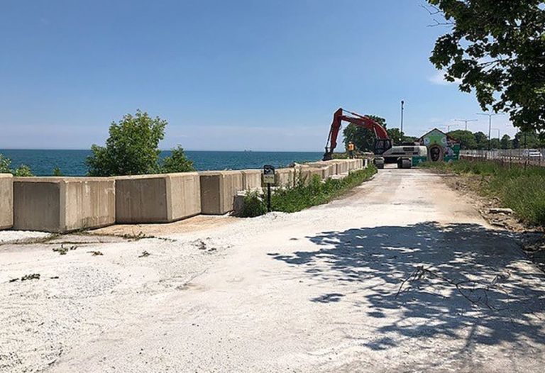 The contractor, SYTE Corporation, is currently installing armor stone and pre-cast concrete blocks to protect against shoreline erosion caused by record high lake levels.