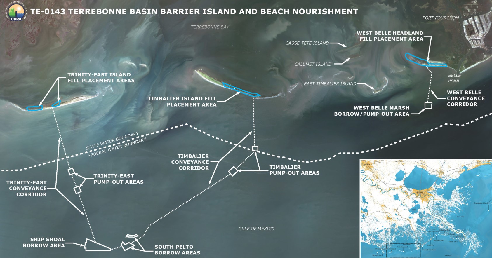 Overall, the project includes restoration and beach nourishment of two barrier islands and one headland on the southern perimeter of the Terrebonne Basin.