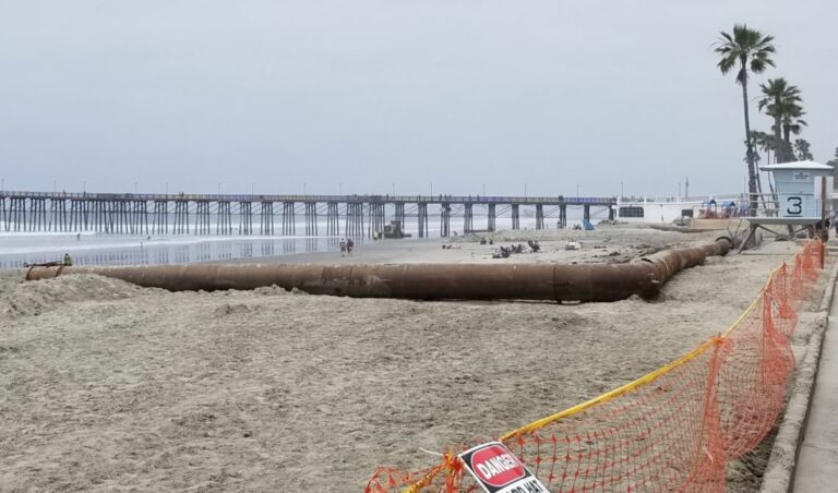 Harbor Beach will be used to stage the delivery of pipe and re-weld the plastic pipe into 500′ sections. Those sections will be dragged to the City beach.