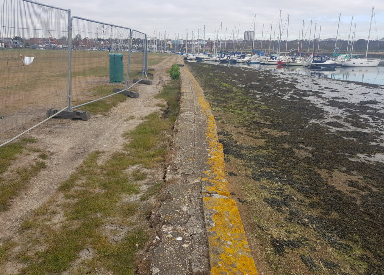 The works include the removal and reconstruction of a 25m X 1.4m section of blockwork seawall along Salterns Recreation Ground.