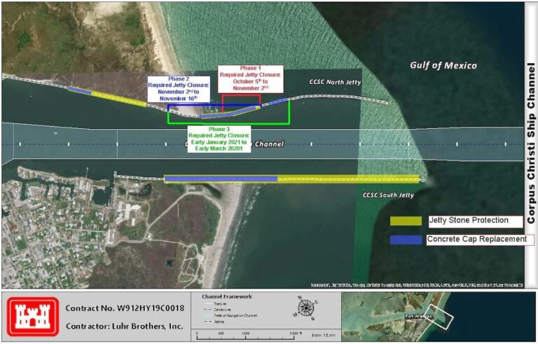 The USACE Galveston District awarded an Option/additional work in the amount of $8.8 million on September 3, for additional areas of repair on the North Jetty under the Corpus Christi Ship Channel – Entrance Channel Jetty Repairs contract.