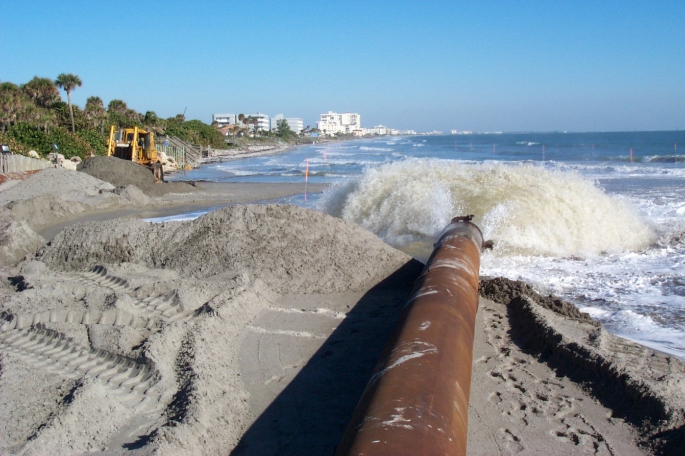 The project consists of dredging beach compatible sand from Canaveral Shoals and placing it on eroded areas of the beach.