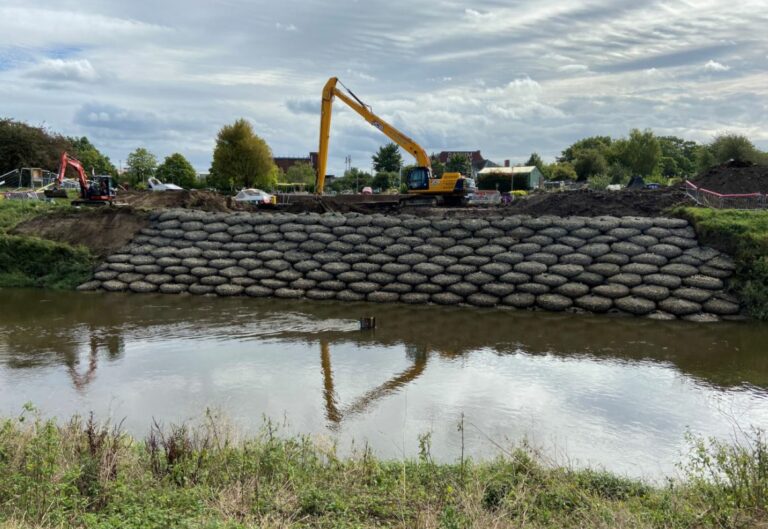 A large 42 tonne excavator was transported to site using a pontoon as part of the work. In fact, large barges were used to transport materials in to repair the bank.