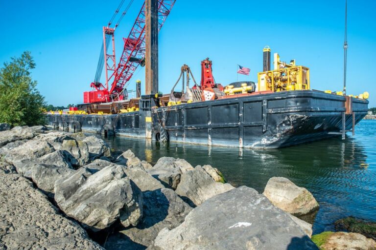 Despite COVID-19 related delays affecting supplies and personnel, the contractor completed sheet pile installation, tie rods, whalers, granular fill, and concrete bulkhead. All wave absorber stones have been placed and roughly 50% of rebar has been installed.