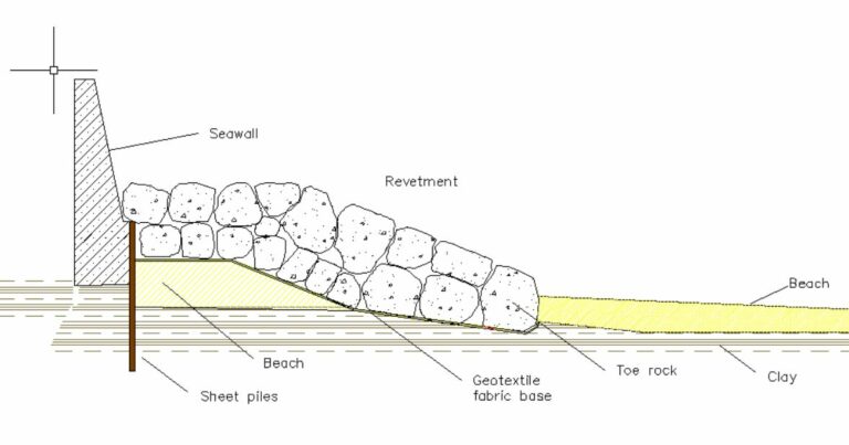 • Further stabilization works were also undertaken to sections of the failed seawall, including steel sheets and girders reinforcing the failing seawall behind the newly constructed rock revetment. Repairs have also been undertaken to timber groynes along the beach to manage the movement of shingle by interrupting the longshore drift of material.