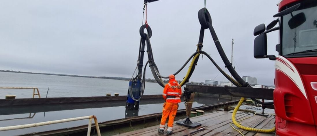 Now, the site has to be filled. To do this, 350.000 m3 of soil will be dredged from the local river, “Göta Älv”.