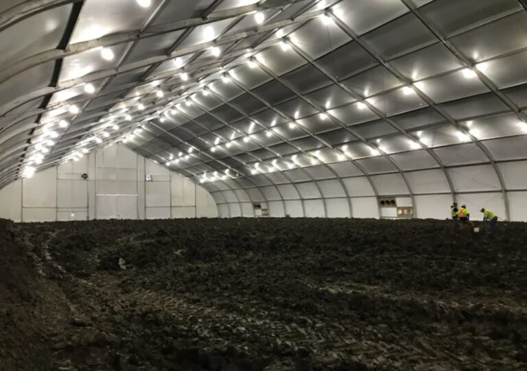 The project is utilizing eight heated tents to condition cohesive material so it can be placed along the setback alignment. Conditions in the tents allow for drying of the material and placement of up to 6,000 cubic yards of material per day.