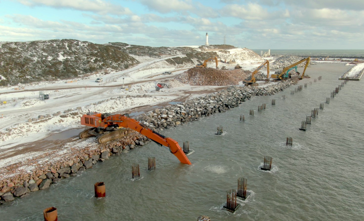 As reported, in the next weeks more core material and rock armour will be placed on the quays, and preparation work will be carried out on the material which will become the foundations of the Crown Wall.