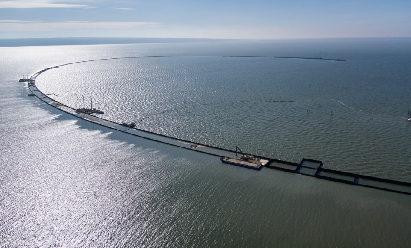 Overall, the project includes construction of two breakwaters, a channel, dredging, bridge construction, four sluice gates, buildings, landscaping as well as the adjacent roads and the soil reinforcement of the roads embankments.