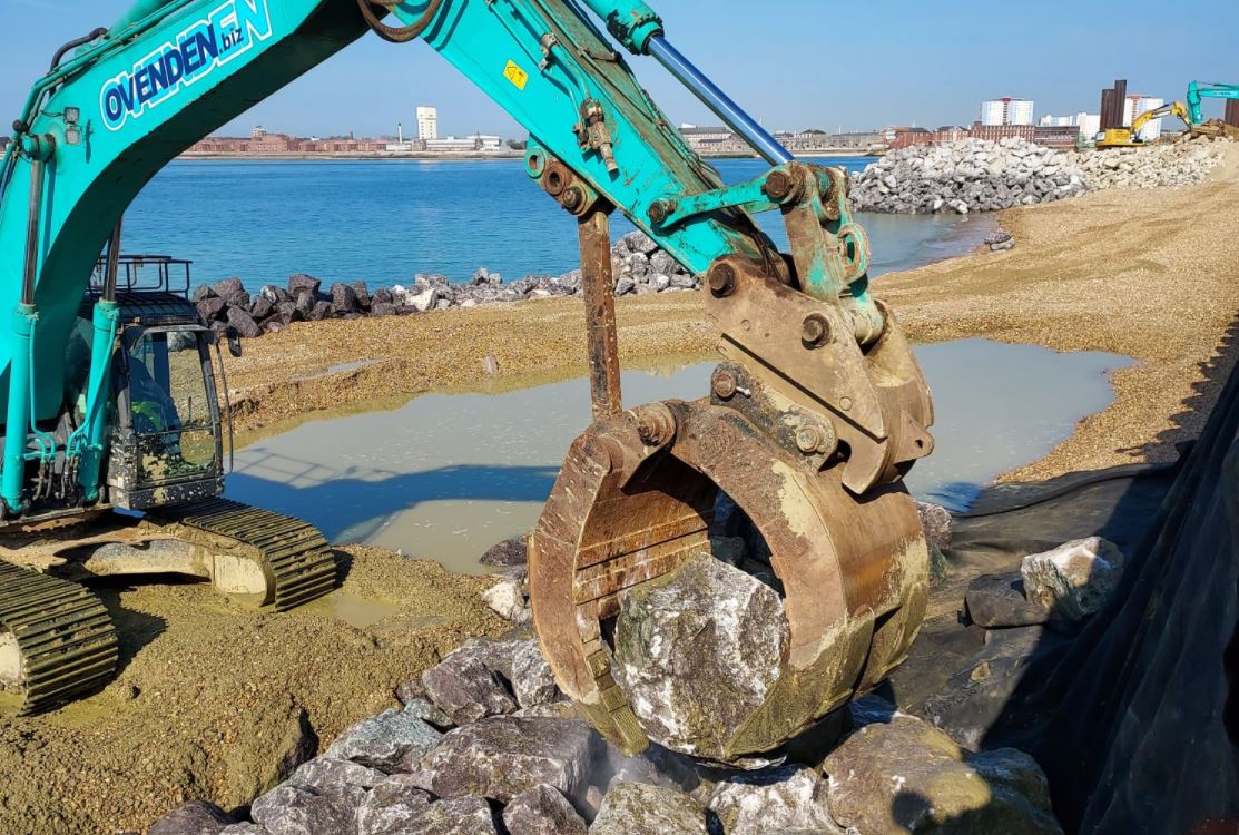 To ensure the rocks are stable for years to come, they are placed on a hardwearing geotextile layer which prevents smaller sediments underneath displacing and causing movement. Rocks from the previous delivery were placed this week and now stretch at least 40 metres from Clarence Pier.