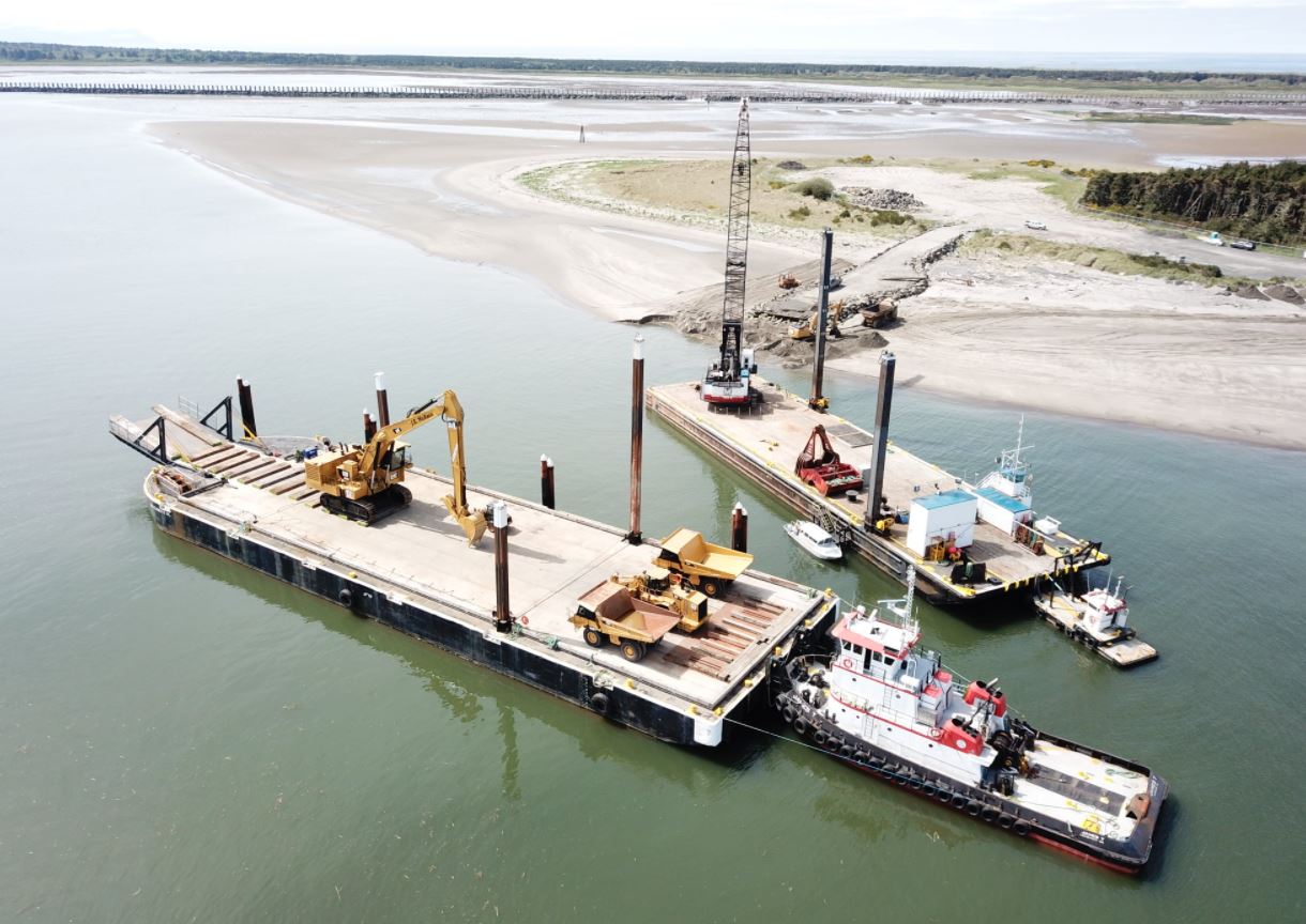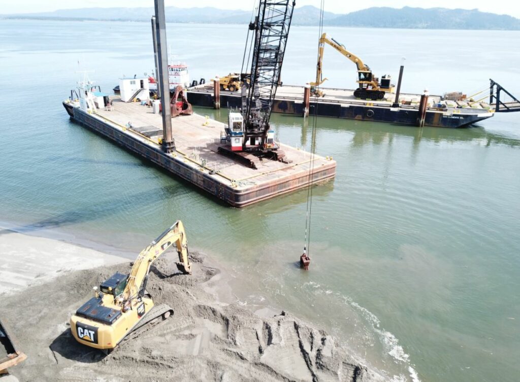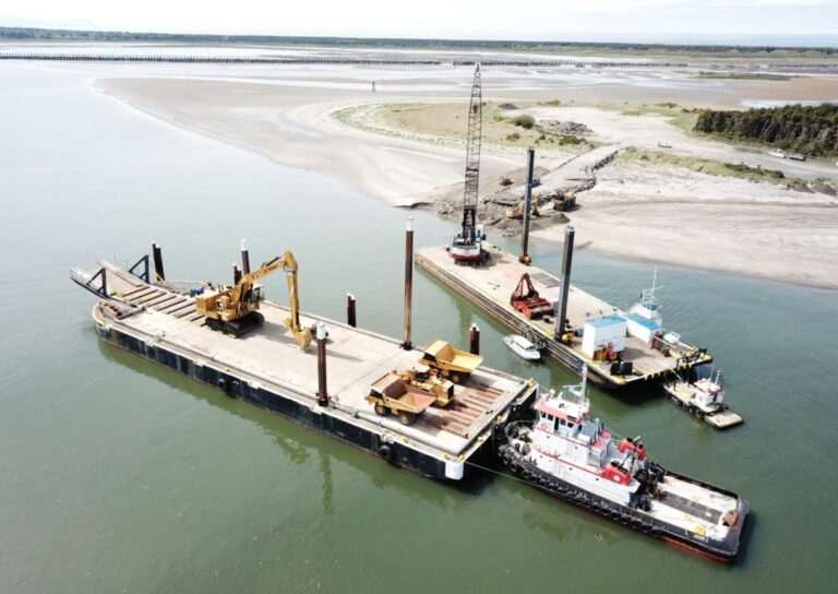 J.E. McAmis dredge crews and land crews worked together yesterday to get the barge landing facility at the MCR South Jetty ready to receive the first barge load of rock for 2021.