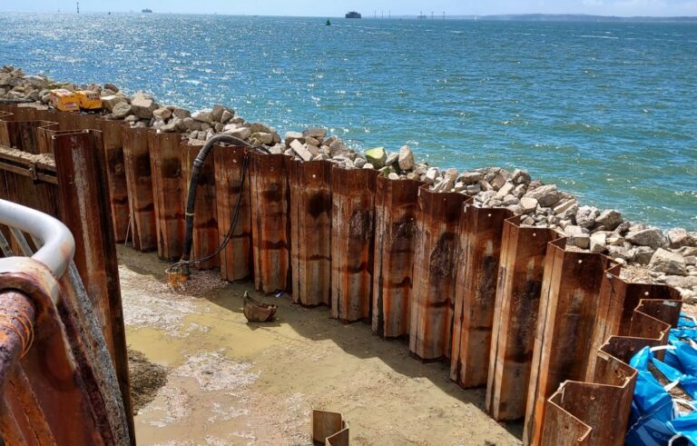 High winds and rough seas last week didn’t hinder the Southsea Coastal Scheme piling work, which is now within touching distance.