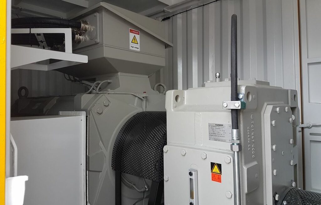 The containerised unit houses the Damen dredge pump, which is driven by a 1,095 kW Siemens electro motor, through a gear box. In a separate space the frequency drive and switch board are located.