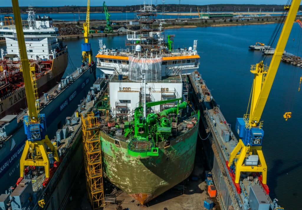 According to WSR, the company’s Floating Dock (FD) 12 – one of the largest in the Baltics – welcomed the 154.6m DP2 Fallpipe vessel FLINTSTONE, which is considered one of the most difficult vessels visiting the yard to date.
