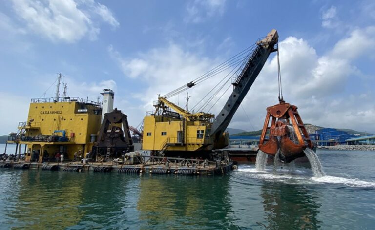 In order to carry out dredging, the Eastern Department used their grab dredger Sakhalinets. The dredger is designed for excavation, extraction and loading of both heavy rock and light categories of soils at a depth of up to 30 meters. Also taking part in the project were dredging barges Posyetskaya and Nevskaya with a hold volume of 600 cubic meters each.