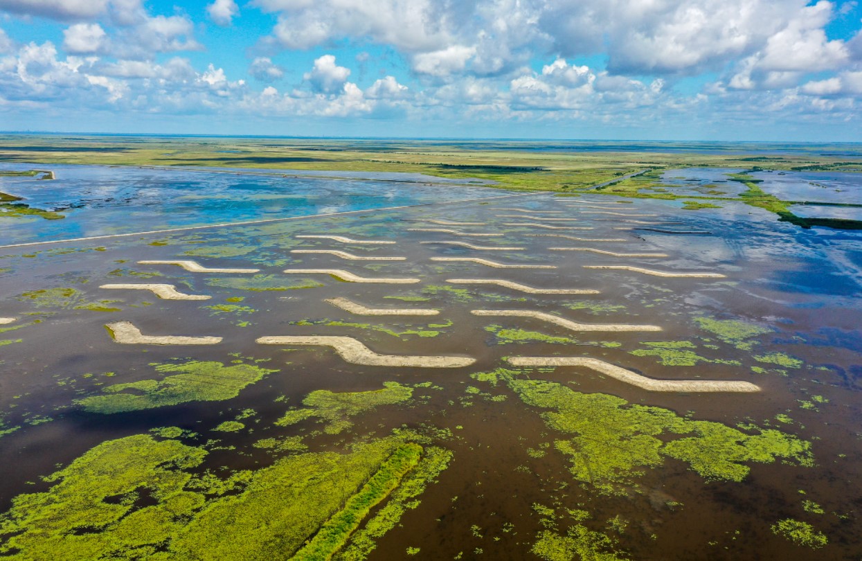 As CPRA reported, almost 3 miles of terraces are complete now and the 300-acre marsh restoration is underway.