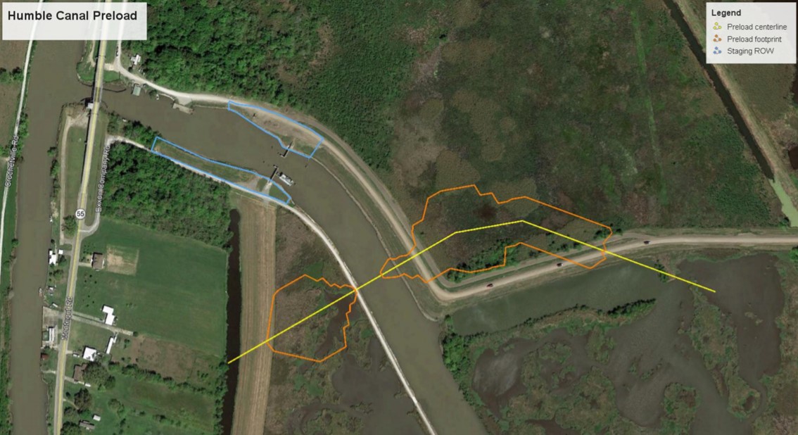 Approximately 150,000 cubic yards of fill and borrow would be excavated and used to construct the preload levee. The proposed preload levee will directly impact approximately 0.1 acres of open water in Humble Canal and approximately 9.6 acres of existing wetlands consisting of bottomland hardwoods and fresh and brackish marsh.