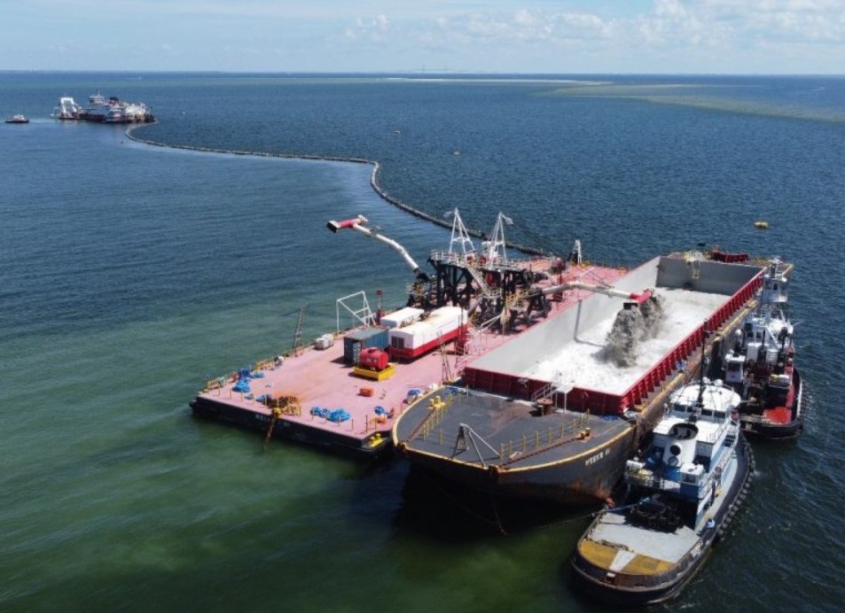 An aerial view of the spider barge used to load scows. Weeks Marine cutterhead dredge C.R. McCaskill can be seen in the background left). The north end of Anna Maria Island is on the right (13 September 2021/Olsen Associates, Inc.).