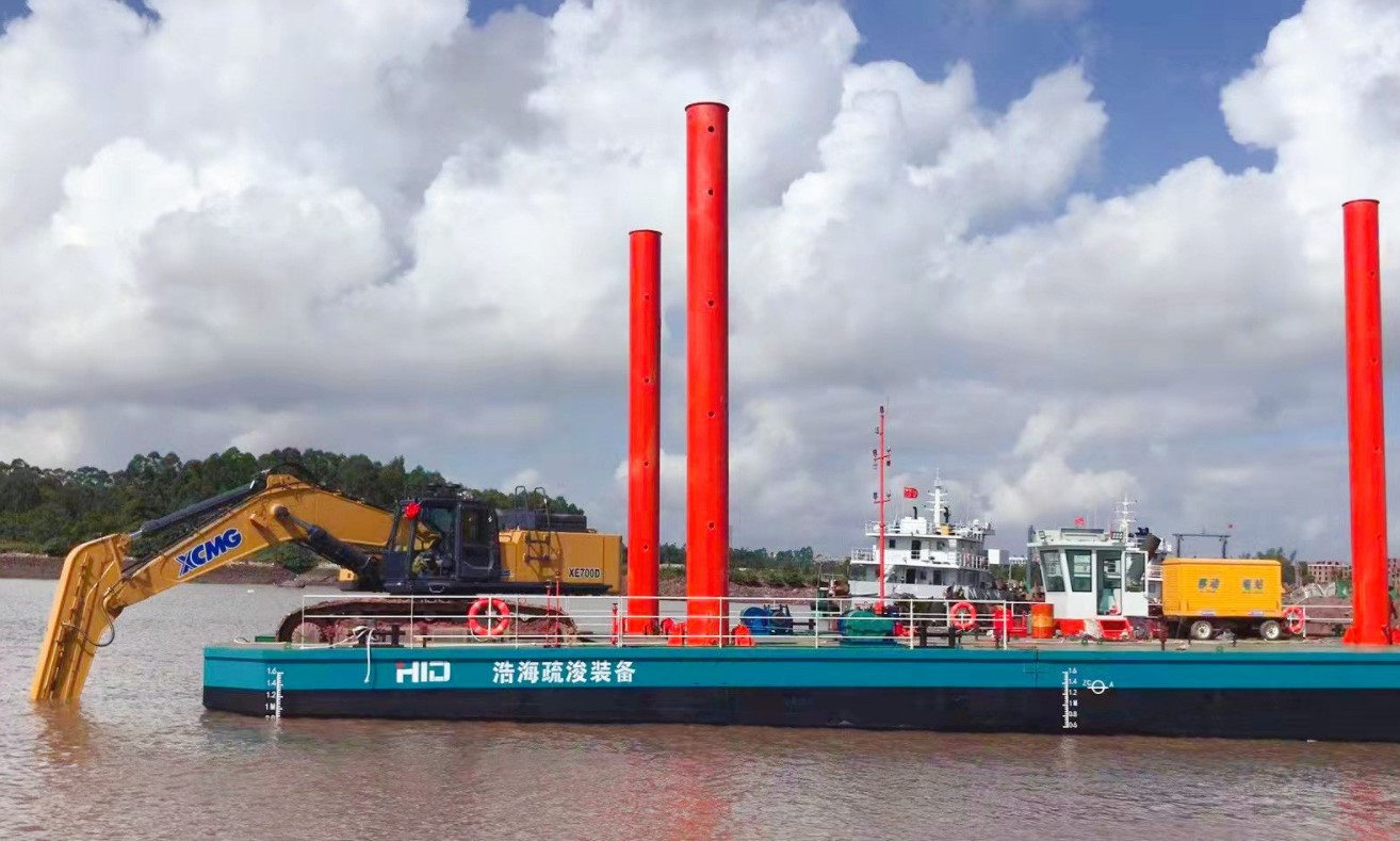 According to the company, the barge is specially developed to support excavator working in water for hard layer dredging project. It can backup excavators dredging and mining in rivers and complex water areas with strong adaptability.