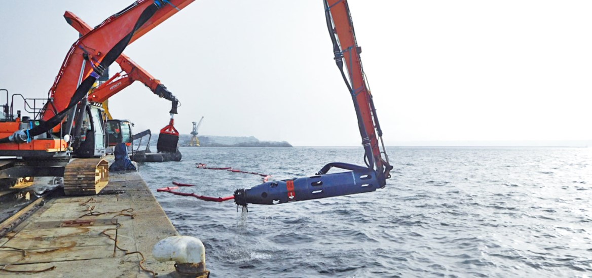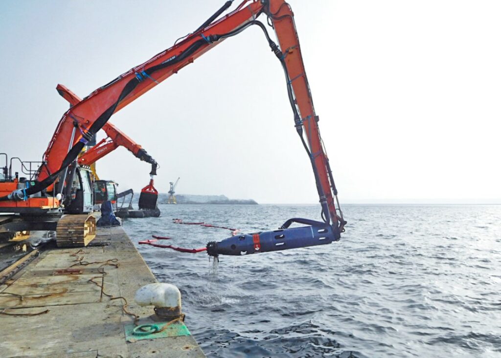 According to Bell, this six week long project at the Brest Naval Base consisted of dredging sandy sediments present on a rockfill embankment on the underside of a quay, between 8 and 18m under the excavator’s tracks.