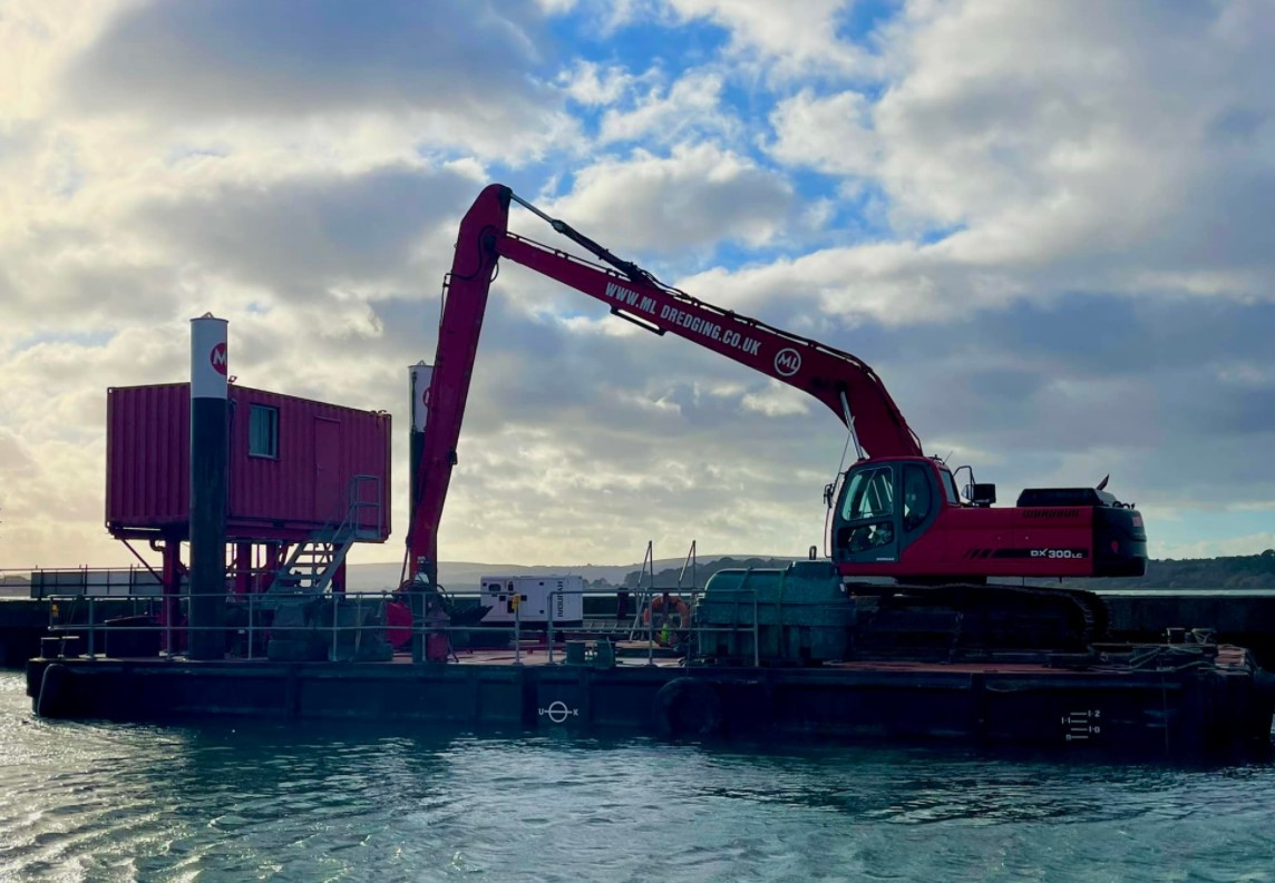 The works were carried out by the dredger Boxer. This modular pontoon can be either equipped with 30 tonne excavator for dredging, or 40 tonne crane for piling work etc. It was designed and built in 2016 by the sister company ML (UK) engineering to Lloyds LR rules.