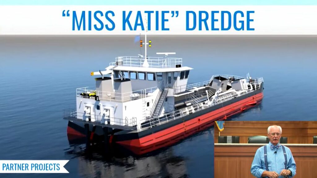 In his presentation, Woodard reported that the Miss Katie Dredge, a new shallow-draft hopper dredge that will be used in the various channels and inlets throughout Dare County, is nearing completion.