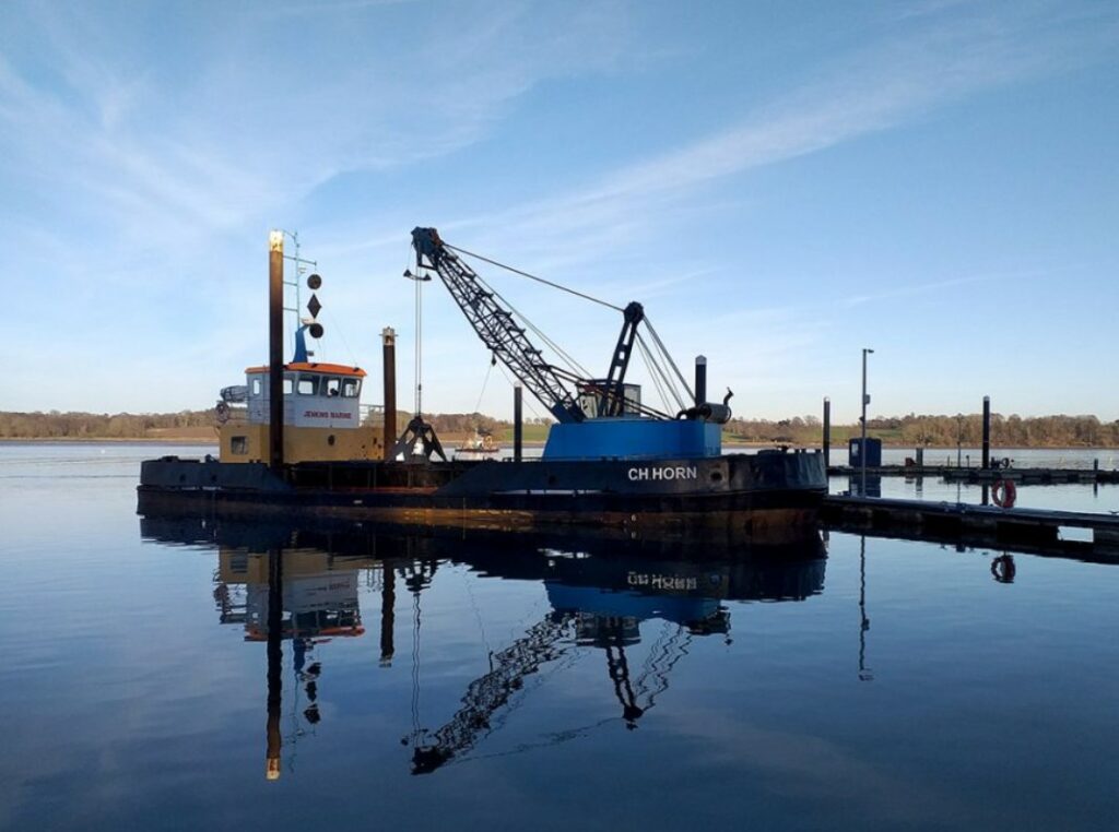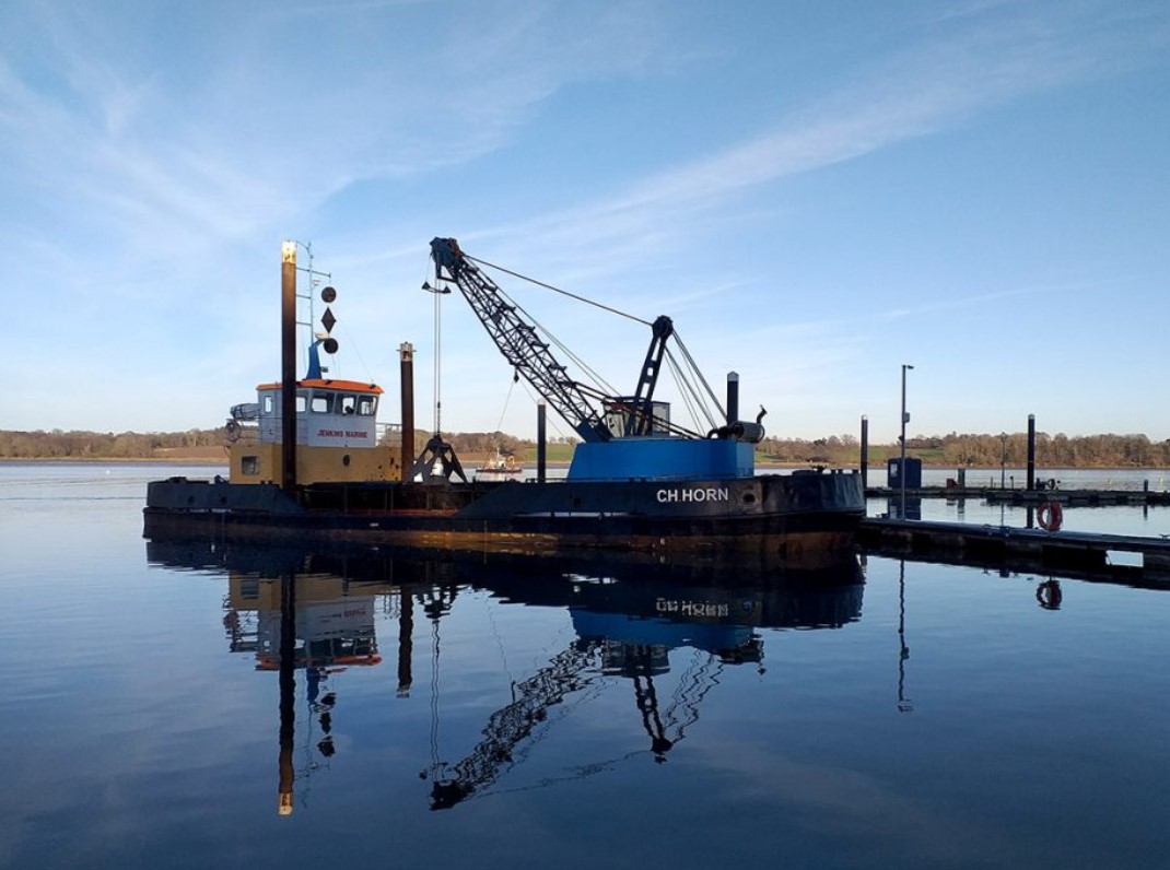 Jenkins Marine grab dredger ‘C H Horn’ has taken a trip to Ipswich to complete maintenance dredging for MDL at the picturesque Woolverstone Marina.