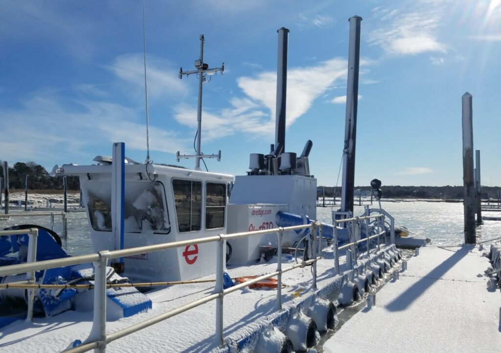 A few days later, on January 12th, dredging started in the inner harbor area and continued on the 13th. Dredging didn’t resume until January 18th due to almost a week of strong winds/seas in Cape Cod Bay.