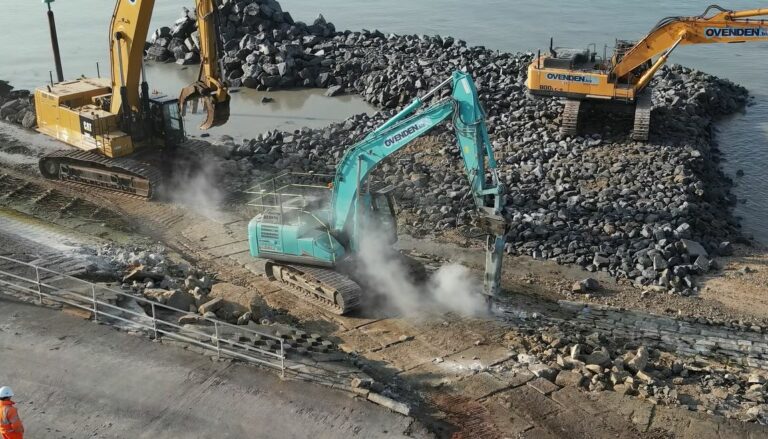 The latest model Dave from Ovenden Earthmoving was Involved in these operations – part of the team moving the granite rock armour into position.