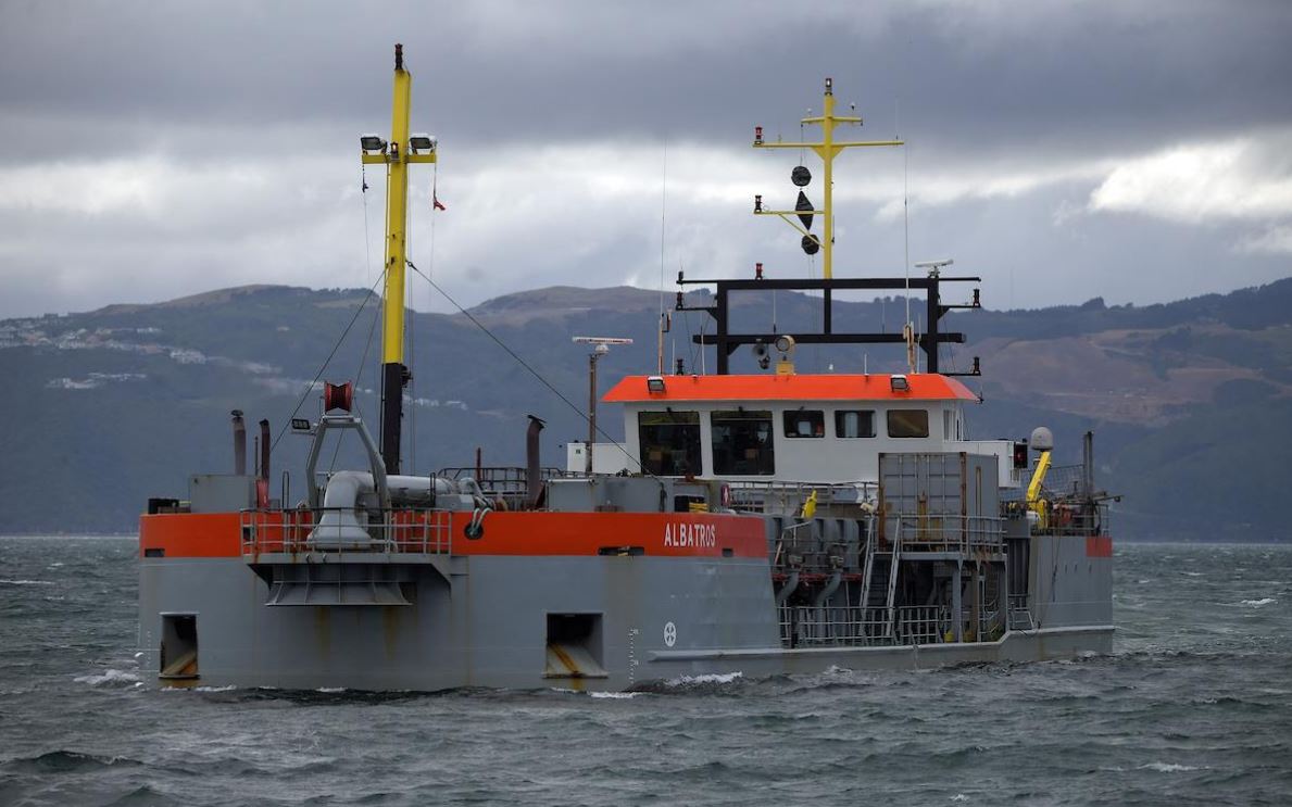 The Dutch Dredging company vessel Albatros returns to clear build-ups of sand in front of the Aotea Quay, and the Thorndon Container, Seaview and Burnham wharves.