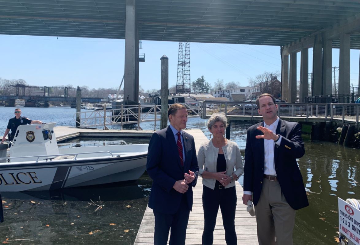 First Selectwoman Jennifer Tooker joined Representative Jim Himes and Senator Richard Blumenthal as they took a boat tour of the Saugatuck River recently to survey conditions and announce $2.81 million in federal funding for proposed dredging activity.