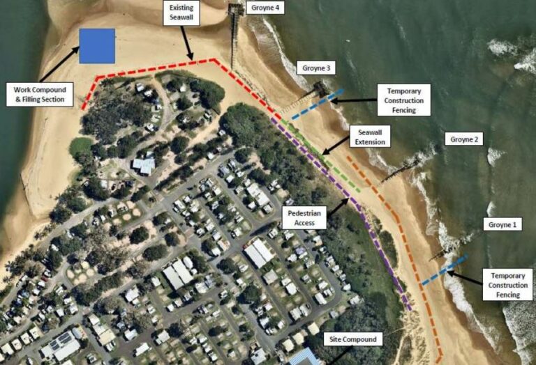 The work will see about 2000 sand-filled geotextile bags laid in formation to make up the renewed groynes, which interrupt wave action, capture sand and provide an erosion buffer to protect the Cotton Tree coastline and adjacent Cotton Tree Holiday Park.
