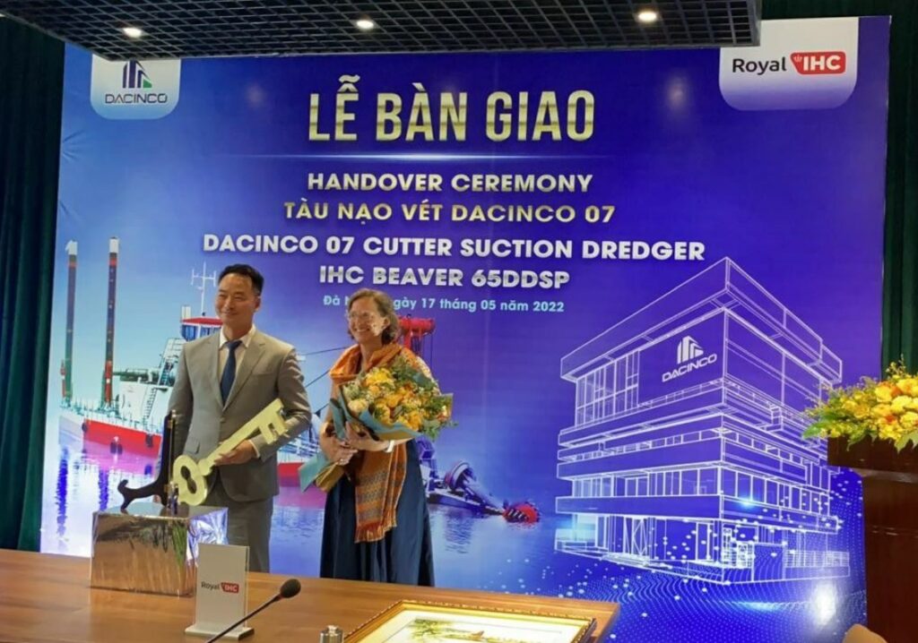 According to IHC, on Tuesday May 17th, Director Dredging Standard Modular Vessels Catina Geselschap handed over the symbolic key of ‘’DACINCO 07’’ during the ceremony in Vietnam.