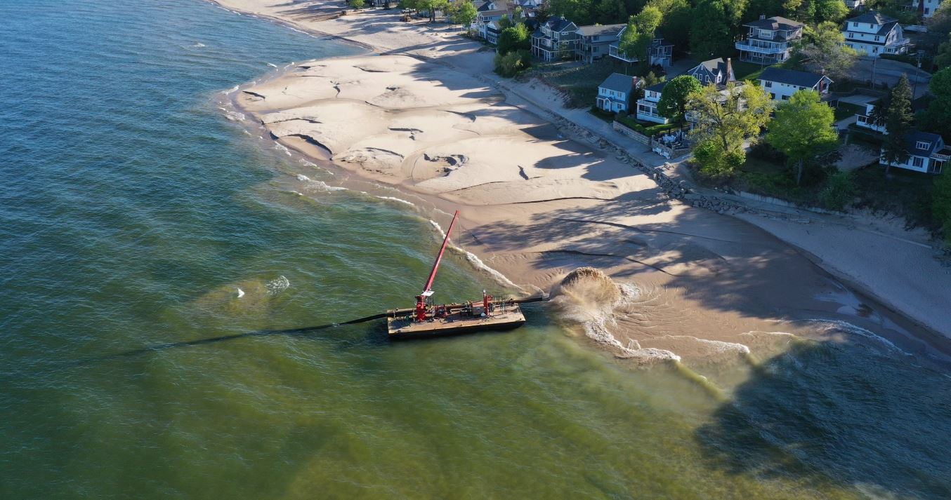 The dredge material is being used as beach nourishment to replenish beaches after erosion during recent high water levels on Lake Michigan.