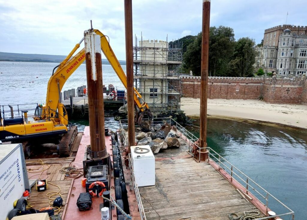 “Piling operations were very sensitive, given the close proximity of the historic buildings of the ‘castle’, and the clients were understandably concerned about the stability and integrity of the structure, A full scaffold was provided for additional support to the nearest structure complete with vibration monitoring,” added Jenkins. “A variable moment vibrator was selected to minimise the potentially harmful low frequency vibrations on hammer startup and shutdown. Thankfully, seabed conditions were favourable and the piling operations produced minimal vibrations with no damage to any buildings.”