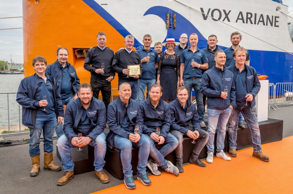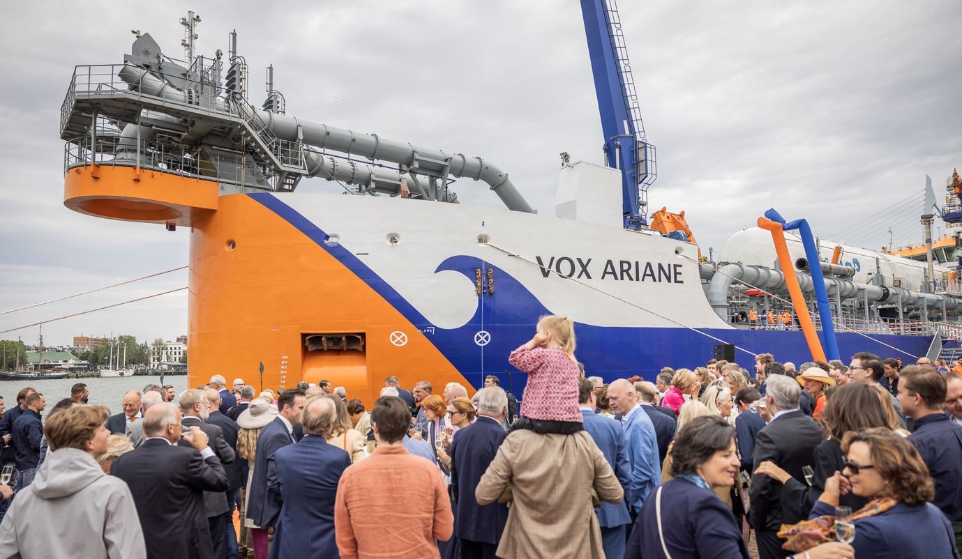 Van Oord unveiled the latest addition to its dredging fleet today. The Vox Ariane, Van Oord’s first trailing suction hopper dredger equipped with an LNG fuel system, was christened by its CFO and member of the Executive Committee Ms. Jolanda Poots-Bijl.