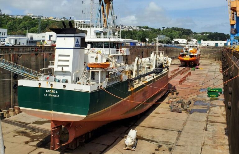 The 2.500m3 trailing suction hopper dredger (TSHD) Andre L visited Damen’s repair yard in Brest recently.