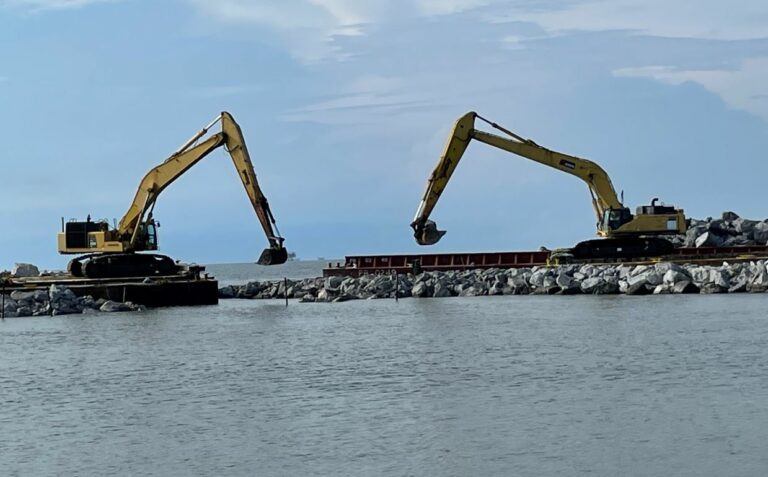 Work on the Grand Isle BBA-18 project is nearing its completion as contractors are placing stone along the tie-in at the west jetty.