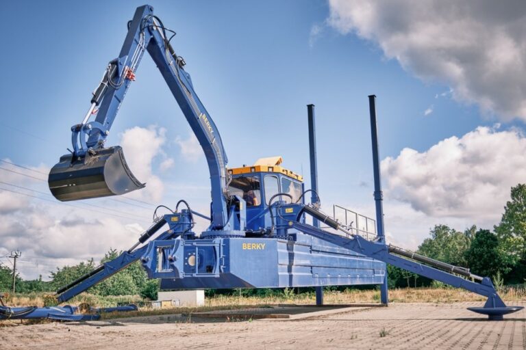 The BERKY Dredge King for example is able to pump up to 770m3/h of muddy substance. Front stilts allow the machine to move on its own in the water and provide a high degree of stability while operating.