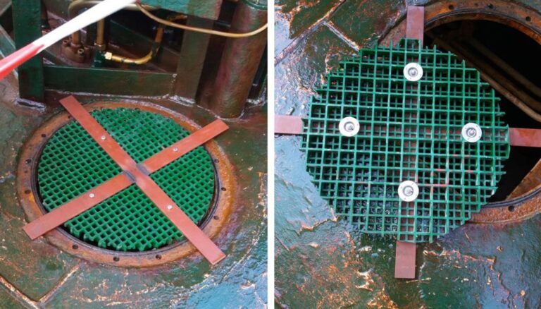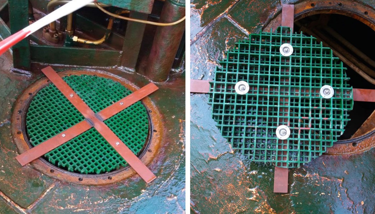 A grid cover is custom made on board and placed in the opening. By doing this personnel can no longer fall into an open manhole and injure themselves. At the same time, the space below can be ventilated. A fan can be placed on top of the cover.