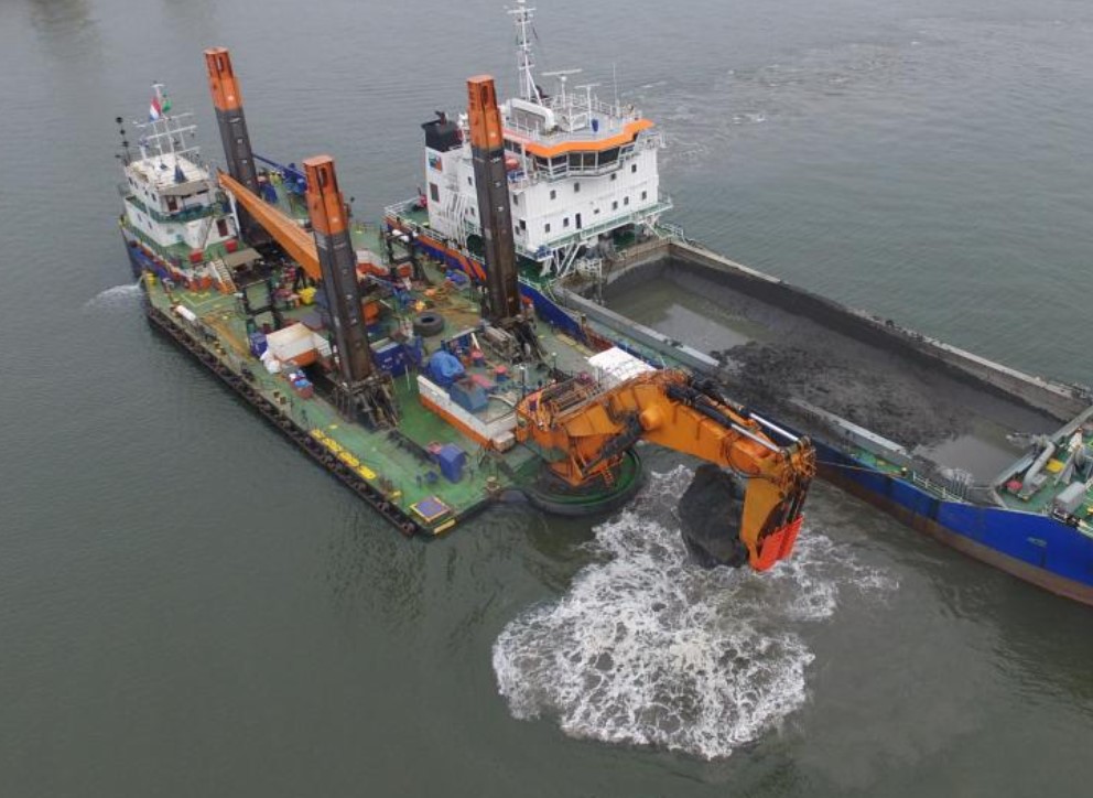 The arrival of the backhoe dredger was necessary due to the many large boulders that were found on the site, approximately 34,000. In order to remove these boulders from the seabed, the contractors will use specialised equipment – the backhoe dredger Goliath.