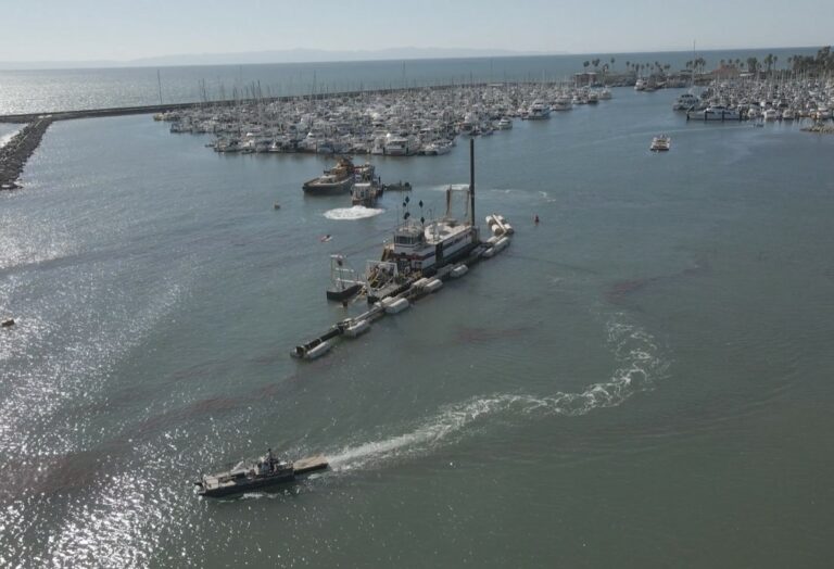 The electric-powered cutter suction dredge Sandpiper arrived in Santa Barbara on January 22, and three days later on Wednesday, January 25, the vessel was dredging the harbor entrance.